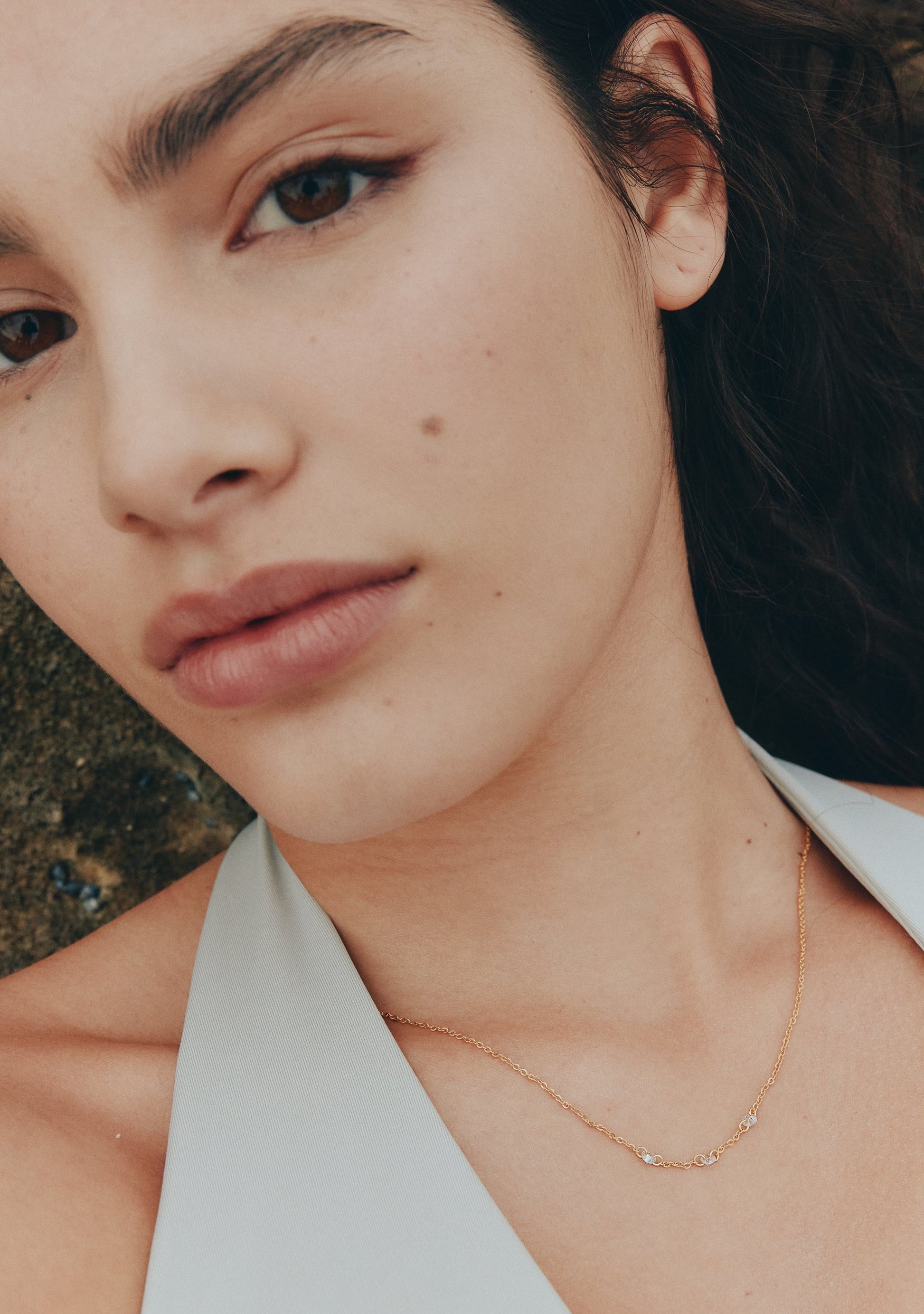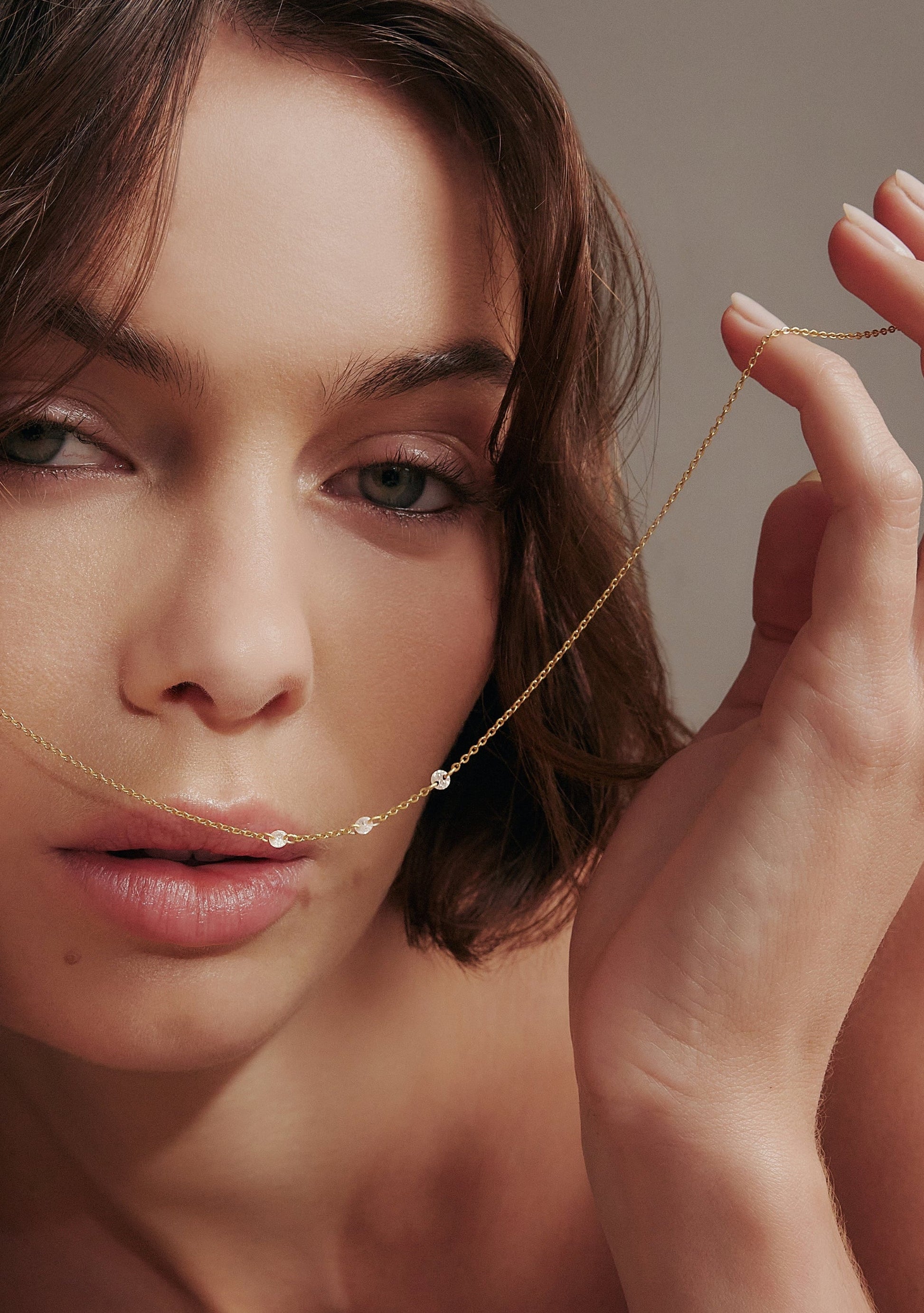 Featuring three luminous stones suspended along a fine chain, their radiance and delicacy enhanced by an innovative no-setting design that captures light from every angle - like sunlight dancing on water.