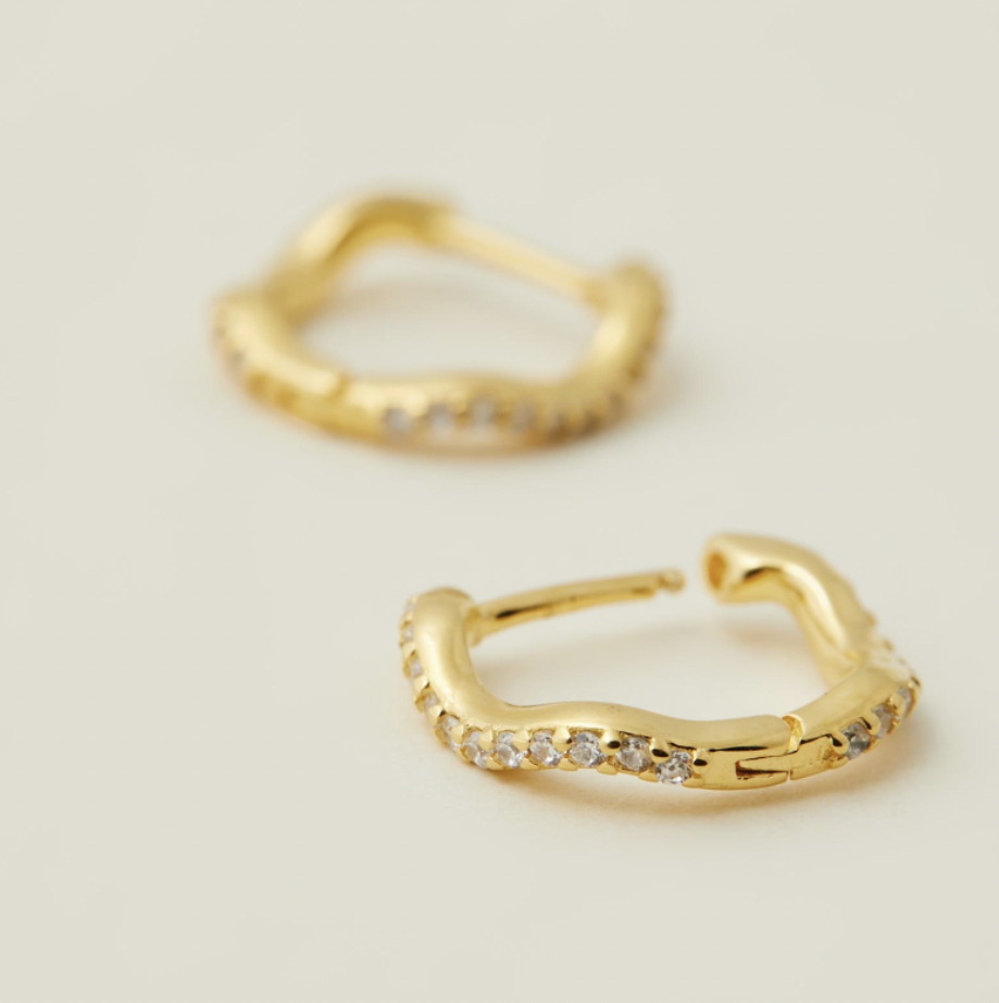 The Luna Wave Huggies are the perfect everyday addition, featuring a unique curved shape, light catching CZ stones and lightweight design, these huggies are perfect for day to night. Complete your look with the Luna Wave Hoops for a modern ear stack sure to compliment any outfit.